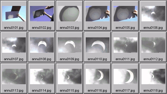 Registered users: Click on thumbnail to view jpeg preview. Captions down below. No password? Click here. Registration is free to the industry. Photos 19-36 Captions: annu0101.tif Image of Sun, including sunspots, projected through a telephoto camera lens onto white cardboard, about 5:15 pm local, Partial annular eclipse, San Diego Calif., 10 JUNE 2002. annu0102.tif Image of Sun, including sunspots, projected onto white cardboard, Partial annular eclipse, San Diego Calif., 10 JUNE 2002. annu0103.tif Image of Sun, including sunspots, projected onto white cardboard, Partial annular eclipse, San Diego Calif., 10 JUNE 2002. annu0104.tif Image of Sun, including sunspots, projected onto white cardboard, Partial annular eclipse, San Diego Calif., 10 JUNE 2002. annu0105.tif Image of Sun, including sunspots, projected onto white cardboard, Partial annular eclipse, San Diego Calif., 10 JUNE 2002. annu0106.tif Approx. 60% coverage, about 6:05 pm local, image of sun attenuated through clouds, Partial annular eclipse, San Diego Calif., 10 JUNE 2002. Image information: Nikon D1, ISO 200, 300mm f/4 w/ 1.4x teleconverter (effective 630mm), camera-selected aperture and shutter speed (around 1/2000 at f16). annu0107.tif Partial annular eclipse, San Diego Calif., 10 JUNE 2002. annu0108.tif Partial annular eclipse, San Diego Calif., 10 JUNE 2002. annu0109.tif Partial annular eclipse, San Diego Calif., 10 JUNE 2002. annu0110.tif Approx. 75% coverage, about 6:20pm local, Partial annular eclipse, San Diego Calif., 10 JUNE 2002. annu0111.tif Partial annular eclipse, San Diego Calif., 10 JUNE 2002. annu0112.tif Partial annular eclipse, San Diego Calif., 10 JUNE 2002. annu0113.tif Maximum coverage, approx. 6:24pm local, Partial annular eclipse, San Diego Calif., 10 JUNE 2002. annu0114.tif Partial annular eclipse, San Diego Calif., 10 JUNE 2002. annu0115.tif Partial annular eclipse, San Diego Calif., 10 JUNE 2002. annu0116.tif Partial annular eclipse, San Diego Calif., 10 JUNE 2002. annu0117.tif Partial annular eclipse, San Diego Calif., 10 JUNE 2002. annu0118.tif Partial annular eclipse, San Diego Calif., 10 JUNE 2002. Home Browse Search Contact Subscribe Return to Galleries 23 JUNE 2002 All photos and content copyright © 1981-2010 PHOTOSPORT.COM. All Rights Reserved. |