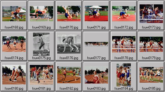 Registered users: Click on thumbnail to view full size. Captions down below. No password? Click here. Registration is free to the industry. Photos 163-180 Captions: fsuw0168.tif Women's highjumping, Warmerdam Field, CSU Fresno, 1997. fsuw0169.tif Women's highjumping, Warmerdam Field, CSU Fresno, 1997. fsuw0170.tif Women's highjumping, Warmerdam Field, CSU Fresno, 1997. fsuw0171.tif Women's highjumping, Warmerdam Field, CSU Fresno, 1997. fsuw0172.tif Women's highjumping, Warmerdam Field, CSU Fresno, 1997. fsuw0173.tif Melissa Price and Claire Boykin run 110 hurdles, heptathlon, Warmerdam Field, CSU Fresno, 1997. fsuw0174.tif Women's relay, Warmerdam Field, CSU Fresno, 1997. fsuw0175.tif Women's relay, Warmerdam Field, CSU Fresno, 1997. fsuw0176.tif Women's relay, Warmerdam Field, CSU Fresno, 1997. fsuw0177.tif Women's 110 hurdles, panorama, Warmerdam Field, CSU Fresno, 1997. fsuw0178.tif Women's 110 hurdles, Warmerdam Field, CSU Fresno, 1997. fsuw0179.tif Women's 110 hurdles, Warmerdam Field, CSU Fresno, 1997. fsuw0180.tif Ardin Harrison gets set, Warmerdam Field, CSU Fresno, 1997. fsuw0181.tif Relay handoff, Warmerdam Field, CSU Fresno, 1997. fsuw0182.tif Finish line, Warmerdam Field, CSU Fresno, 1997. fsuw0183.tif Finish line, Warmerdam Field, CSU Fresno, 1997. fsuw0184.tif Danielle Nelson, Warmerdam Field, CSU Fresno, 1997. fsuw0185.tif Pack, 1600, Warmerdam Field, CSU Fresno, 1997. Home Browse Search Contact Subscribe Return to Galleries 16 JUNE 1998 All photos and content copyright © 1981-2010 PHOTOSPORT.COM. All Rights Reserved. |