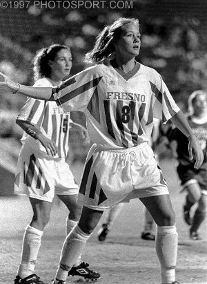 Kristin Sinclair awaits corner kick, CSU Fresno vs. Sonona, 1997