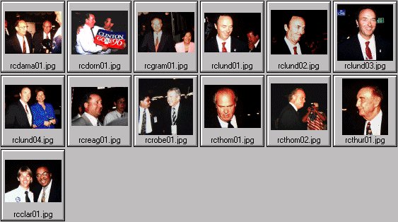 Registered users: Click on thumbnail to view full size. Captions down below. No password? Click here. Registration is free to the industry. Photos 37-54 Captions: rcdama01.jpg D'Amato at '96 Republican Convention, San Diego, Calif. rcdorn01.jpg Rep. Bob Dornan with fanatic supporter. rcgram01.jpg Sen. Phil Gramm. rclund01.jpg Calif. Atty. General Dan Lundgren. rclund02.jpg Calif. Atty. General Dan Lundgren. rclund03.jpg Calif. Atty. General Dan Lundgren. rclund04.jpg Calif. Atty. General Dan Lundgren, with wife. rcreag01.jpg Conservative radio commentator Mike Reagan rcrobe01.jpg Pat Robertson. rcthom01.jpg Tennessee Sen. Fred Thompson. rcthom02.jpg Tennessee Sen. Fred Thompson. rcthur01.jpg Strom Thurmond. rcclar01.jpg Moderate columnist Clarence Page with Tom Engelhorn. Home Browse Search Contact Subscribe Return to Galleries 27 MAR 1999 All photos and content copyright © 1981-2010 PHOTOSPORT.COM. All Rights Reserved. |