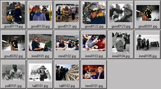 Registered users: Click on thumbnail to view full size. Captions down below. No password? Click here. Registration is free to the industry. Photos 19-36 Captions: good0119.tif Beth Goudreau of Fresno City Fire No. 3 removes a tree with a chainsaw prior to practice blaze at condemned house in Clovis, 1995. good0120.tif Beth Goudreau of Fresno City Fire No. 3 after her first structure, 1995. good0121.tif Beth Goudreau of Fresno City Fire No. 3 meets with other firefighters before practice blaze at condemned house in Clovis, 1995. good0122.tif Beth Goudreau of Fresno City Fire No. 3 removes a tree with a chainsaw prior to practice blaze at condemned house in Clovis, 1995. good0123.tif Beth Goudreau of Fresno City Fire No. 3 celebrates putting out her first fire with a friendly black lab. good0201.tif Beth Goudreau of Fresno City Fire No. 3 "makes a lake" at practice blaze at condemned house in Clovis, 1995. good0202.tif Beth Goudreau of Fresno City Fire No. 3 "makes a lake" at practice blaze at condemned house in Clovis, 1995. immi0101.tif New American displays his certificate of citizenship at a mass swearing-in at Fresno State's football stadium, 1997. immi0102.tif Immigrants take oath of citizenship at a mass swearing-in at Fresno State's football stadium, 1997. immi0103.tif New American is registered to vote as a Democrat after a mass swearing-in at Fresno State's football stadium, 1997. immi0104.tif Esteban Soto takes oath of citizenship at a mass swearing-in at Fresno State's football stadium, 1997. immi0105.tif 16 illegal immigrants are cleared out of a van after a hit-and-run accident in Clovis, Calif., May 1996. They were released after the INS failed to claim them. poll0101.tif Syringe found at Imperial Beach during cleanup, 1993. tail0101.tif Protester waves sign at an anti-Tailhook rally and march on Miramar Naval Air Station, San Diego, Calif., 1992. tail0102.tif Protesters present demands at the north gate of Miramar Naval Air Station at the end of an anti-Tailhook march, San Diego, Calif., 1992. term0101.tif Sylvester Bakula dines at the Clovis Elks Lodge, at dinner for terminal cancer patients in 1997. Home Browse Search Contact Subscribe Return to Galleries 26 MAR 1999 All photos and content copyright © 1981-2010 PHOTOSPORT.COM. All Rights Reserved. |